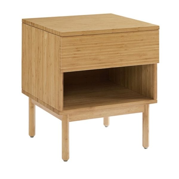 Sencillo y versátil, el diseño de líneas limpias de la mesa de noche Ria se realza con la cálida veta natural del bambú sostenible. Fabricada en bambú sólido, el marco de la Ria está diseñado para adaptarse fácilmente a espacios más pequeños y ofrece almacenamiento abierto y cerrado. El cajón de construcción sólida, con frente de bambú y guías de extensión de rodamientos, asegura un movimiento suave y seguro gracias a los topes de seguridad que mantienen el cajón en su lugar.